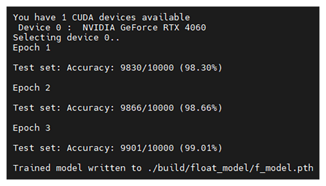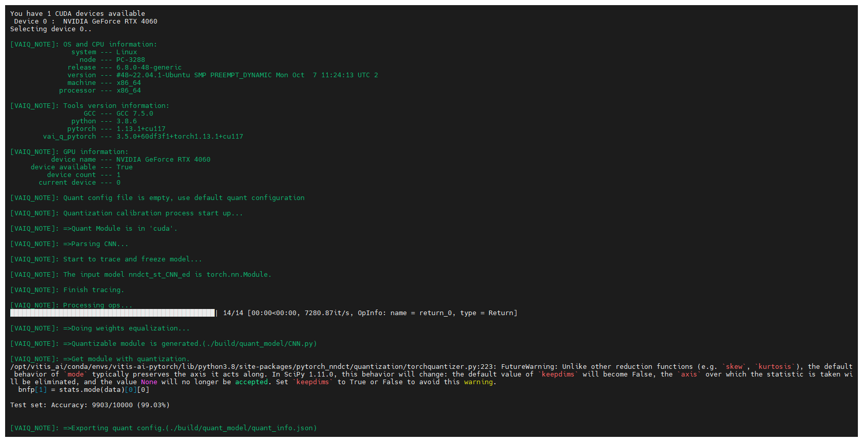 $ python -u quantize.py -d ${BUILD} --quant_mode test 2>&1 | tee ${LOG}/quant_test.log # quantize.py をテストモードで実行し、その出力をリアルタイム表示しながらログとして記録
